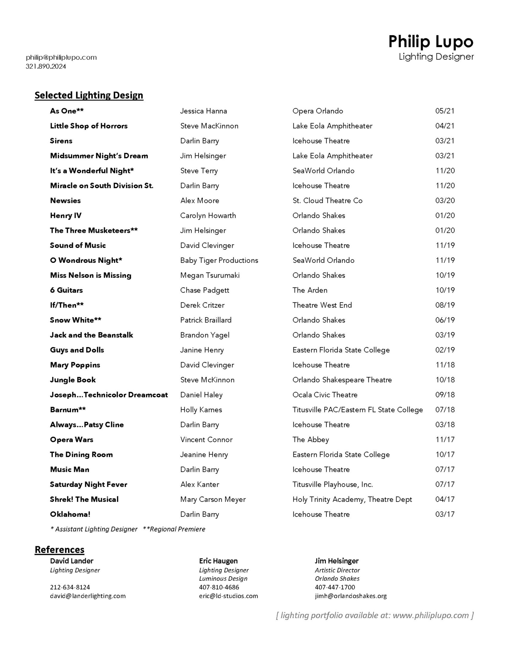 Philip is a regional Lighting, Sound, and Video Designer whose credits include: O’ Wondrous Night (SeaWorld Orlando), The Three Musketeers (Orlando Shakes), Little Shop of Horrors (Orlando Shakes), Into the Woods (DreamCatcher Theatre), and Opera Wars (Opera del Sol). His non-theatrical lighting projects can be seen in television stations from Palm Beach to Las Vegas and in architectural spaces like Dallas Fort-Worth Airport and the Velana International Airport in the Maldives.Philip is the owner and principal designer of P:L Theatrical.